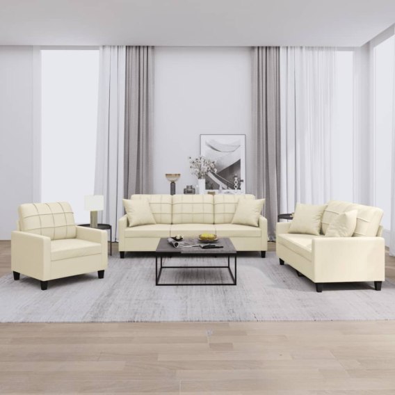 3-CZ KOMPLET WYPOCZYNKOWY Z PODUSZKAMI KREMOWY SZTUCZNA SKÓRA