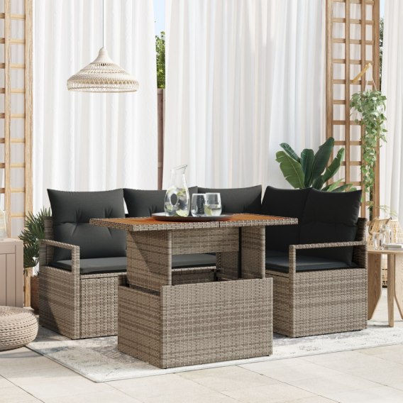 5-CZĘŚCIOWY ZESTAW KANAP OGRODOWYCH Z SZARYMI PODUSZKAMI I AKACJĄ 2-OSOBOWA KANAPA OGRODOWA Z SZARYMI PODUSZKAMI