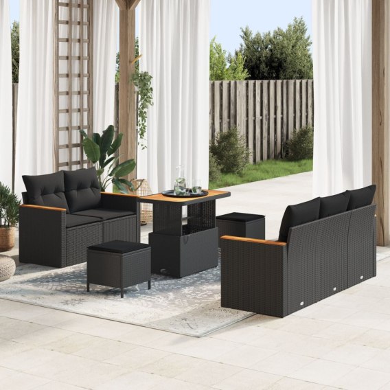 8-CZĘŚCIOWY ZESTAW SOF OGRODOWYCH Z PODUSZKAMI CZARNY POLIRATTAN AKACJA 3-CZĘŚCIOWY ZESTAW JADALNY OGRODOWY Z POD