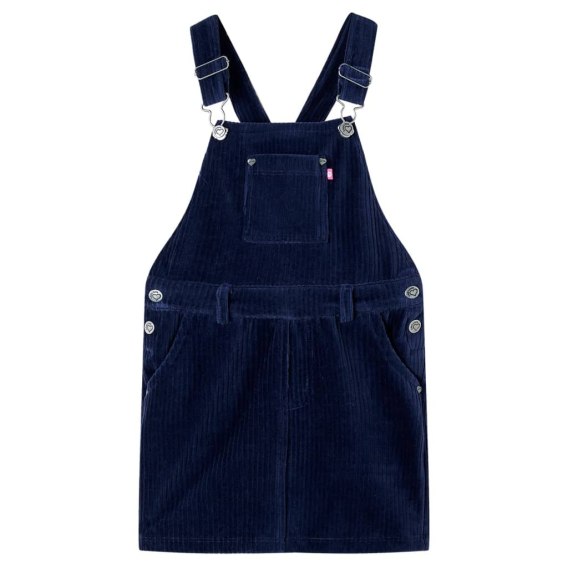 Ta dziecięca sukienka ogrodniczka ma regulowane ramiączka, guziki po bokach i naszywane kieszenie. Wykonano ją z miękkiego sztruksu, który składa się w 58% z bawełny, w 37% z poliestru i w 5% z elastanu, dzięki czemu zapewnia większy komfort.