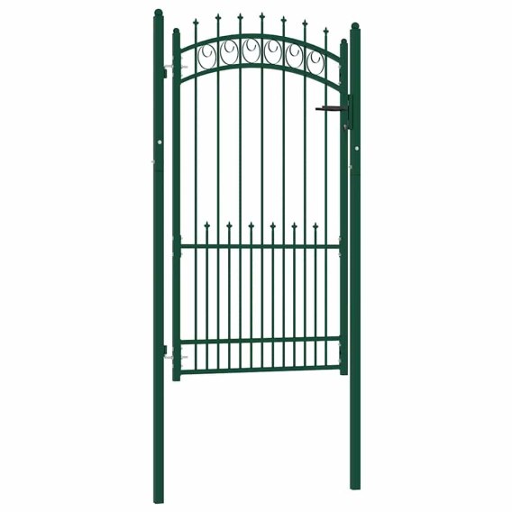 Wykonana z wytrzymałej stali furtka ogrodzeniowa ma solidną konstrukcję i została pomalowana proszkowo w celu zabezpieczenia przed korozją. Dzięki pionowym prętom z grotami i mocnym, poziomym prętom wzmacniającym zapewnia ona wysoki stopień bezpieczeństwa. Wykończenie w formie łuku dodaje jej elegancji. Wyposażono ją w dwa solidne słupki i trwałe zawiasy dla ułatwienia montażu. W zestawie znajduje się również zamek z trzema pasującymi kluczami.