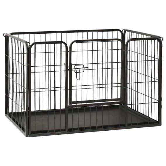 Kojec dla szczeniaków można z łatwością rozstawić i złożyć. Wyposażono go w drzwiczki na zawiasach i z zasuwką, co ułatwia dostęp. Trwały i odporny na czynniki pogodowe kojec wykonany został z krytej proszkowo i odpornej na rdzę stali, sprawdzi się więc świetnie zarówno wewnątrz, jak i na zewnątrz pomieszczeń. Do przesyłki załączona jest również plastikowa podłoga.