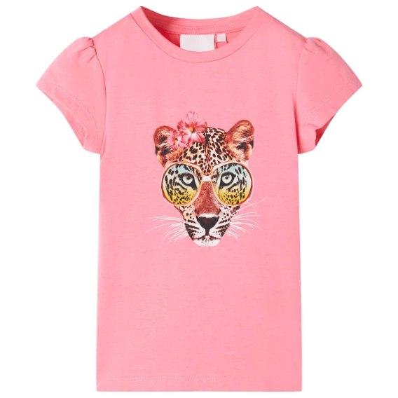 Ta dziecięca koszulka ma krótkie rękawy, okrągły dekolt i prosty krój. Ozdobiono ją głową lamparta w modnych okularach i z kwiatkiem za uchem. Wykonano ją z miękkiego materiału zawierającego 95% bawełny i 5% elastanu, dzięki czemu jest wygodna i przewiewna.