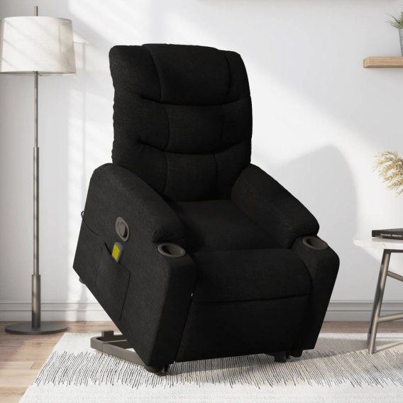 PODNOSZONY FOTEL MASUJĄCY ROZKŁADANY CZARNY OBITY TKANINĄ
