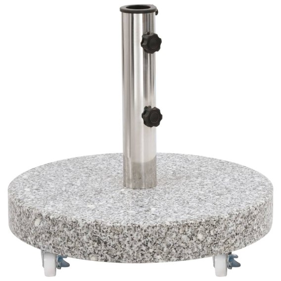 Wykonany z mocnego granitu i ważący 30 kg obciążnik jest niezwykle solidny i zagwarantuje, że Twój parasol będzie stać stabilnie nawet przy wietrznej pogodzie. Uchwyt ten ma 2 śruby mocujące, które przytrzymają parasol we właściwym miejscu. Załączony jest również jeden adapter, dzięki któremu uchwyt jest odpowiedni do parasoli na słupku o średnicy 38/48 mm. Ponadto 4 kółka podstawy parasola ułatwiają jej swobodne przestawianie.