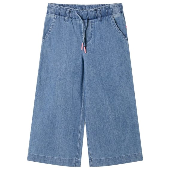 Te spodnie dziecięce mają szerokie nogawki, elastyczny pas i dwie kieszenie z przodu. Kolor niebieskiego denimu jest bardzo modny i świetnie komponuje się z każdym innym ubraniem. Te spodnie z szeroką nogawką wykonano w 100% z bawełny, dzięki czemu są wygodne, przewiewne i trwałe.