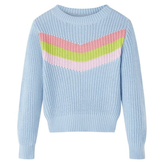 Ten dziecięcy sweterek ma długie rękawy, okrągły dekolt i prosty krój. Sweter dziecięcy ma kolorowe wzory w kształcie litery V. Sweter dziecięcy został wykonany z bawełny o prążkowanym splocie, dzięki czemu zapewnia wyjątkowe ciepło i komfort.