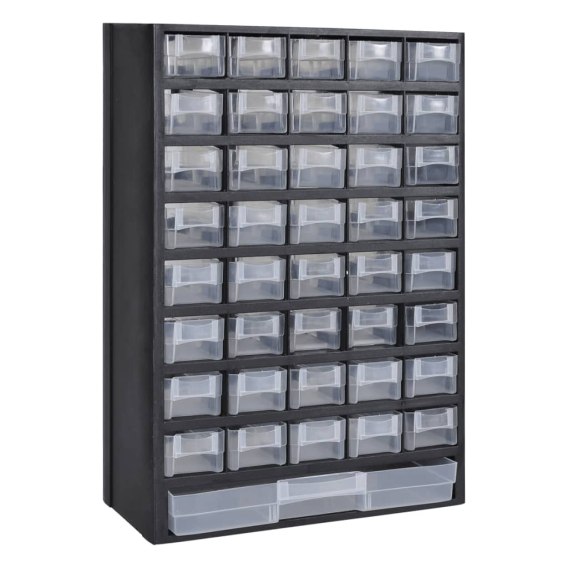 Ta plastikowa skrzynka narzędziowa z 41-szufladami to świetny sposób na uporządkowanie miejsca pracy dzięki 40 małym szufladom i 1 dużej. Idealnie nadaje się do przechowywania wszelkiego rodzaju drobiazgów, takich jak małe części maszyn, akcesoria, a nawet elementy projektów. Możesz wybrać dużą lub małą szufladę w zależności od rozmiaru przedmiotu, które chcesz schować. Trwały, przezroczysty plastik zapewnia widoczność części przechowywanych w szufladzie. Z tyłu pudełka znajdują się 2 małe otwory do zaczepienia go na ścianie lub innej powierzchni.