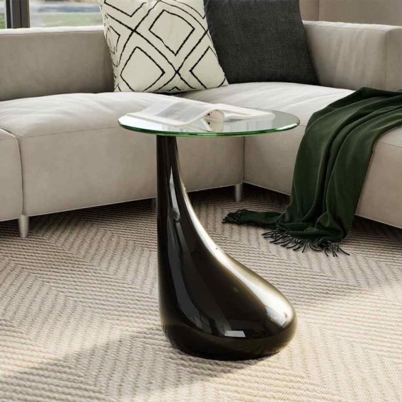 Unikatowa podstawa o wysokim połysku, w kształcie kropli wody nadaje stolikowi wyjątkowy wygląd. Sprawdzi się on znakomicie przed kanapą w salonie albo w sypialni, gdzie zapewni wygodną powierzchnię do trzymania rzeczy w zasięgu ręki. Blat stołu został poddany hartowaniu dla bezpieczeństwa.