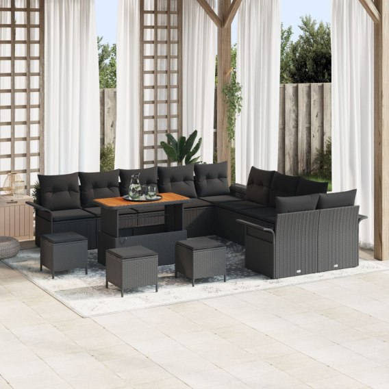 ZESTAW 14-CZĘŚCIOWY SOFA OGRODOWA Z PODUSZKAMI CZARNY POLIRATTAN AKACJA 2-OSOBOWA SOFA OGRODOWA Z PODUSZKAMI CZARNY POLIRATTAN,