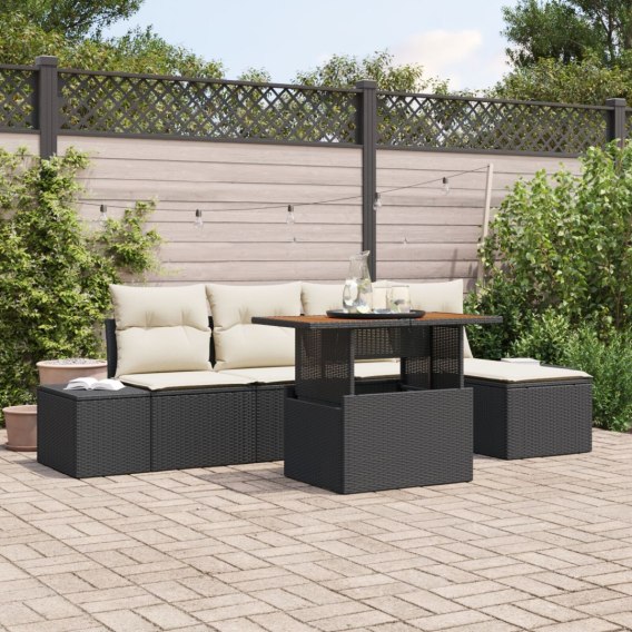 ZESTAW DO JADALNI OGRODOWEJ Z 6 ELEMENTÓW Z PODUSZKAMI CZARNY Z POLIRATTANU I AKACJI