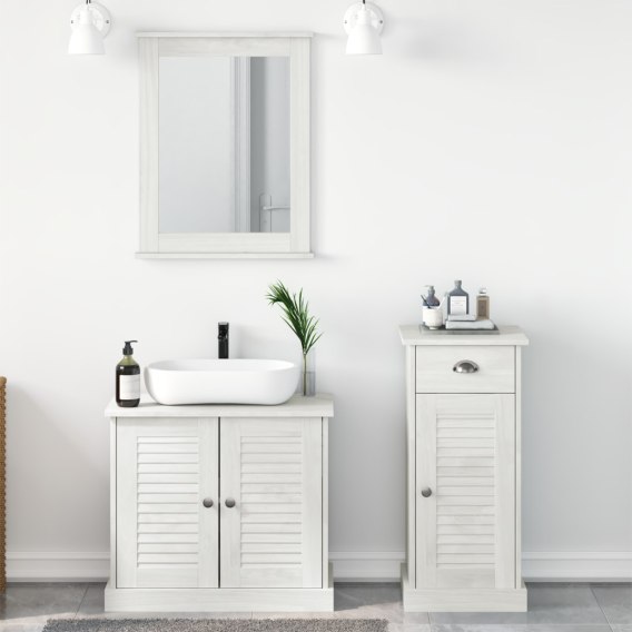 Ten zestaw mebli łazienkowych to fajne połączenie nowoczesnego stylu i praktyczności. Zrobiony z litego drewna sosnowego, jego prostokątny kształt świetnie pasuje do różnych aranżacji łazienki. Czyste linie i mało zdobień dają poczucie spokoju i elegancji. Niezależnie od tego, czy służy do przechowywania, czy jako element dekoracyjny, jego stylowy wygląd i solidna konstrukcja sprawiają, że jest idealnym wyborem do każdej łazienki, zwiększając zarówno estetykę, jak i użyteczność.